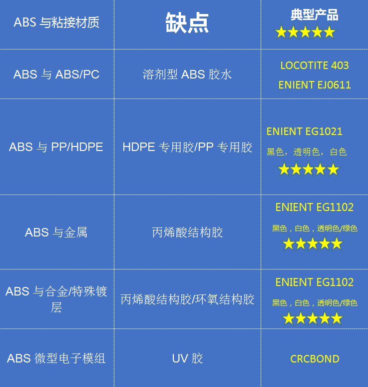 小編用一張圖來說明ABS與不同材質(zhì)粘接的膠水選擇: